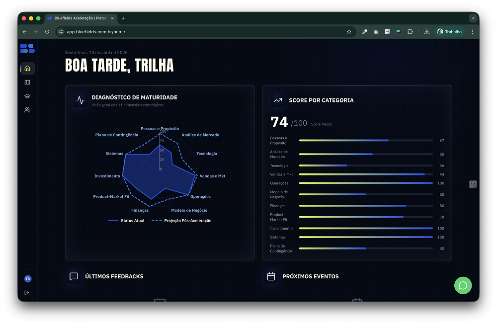 Como um dos pilares dessa fase, a Bluefields lança a nova aceleração, uma plataforma digital que transforma o modelo tradicional em um formato contínuo e personalizado. A solução combina diagnóstico inteligente de maturidade do negócio, trilhas adaptadas ao estágio da startup, mentoria com inteligência artificial, matchmaking com especialistas e uma comunidade integrada de founders, mentores e parceiros estratégicos.
