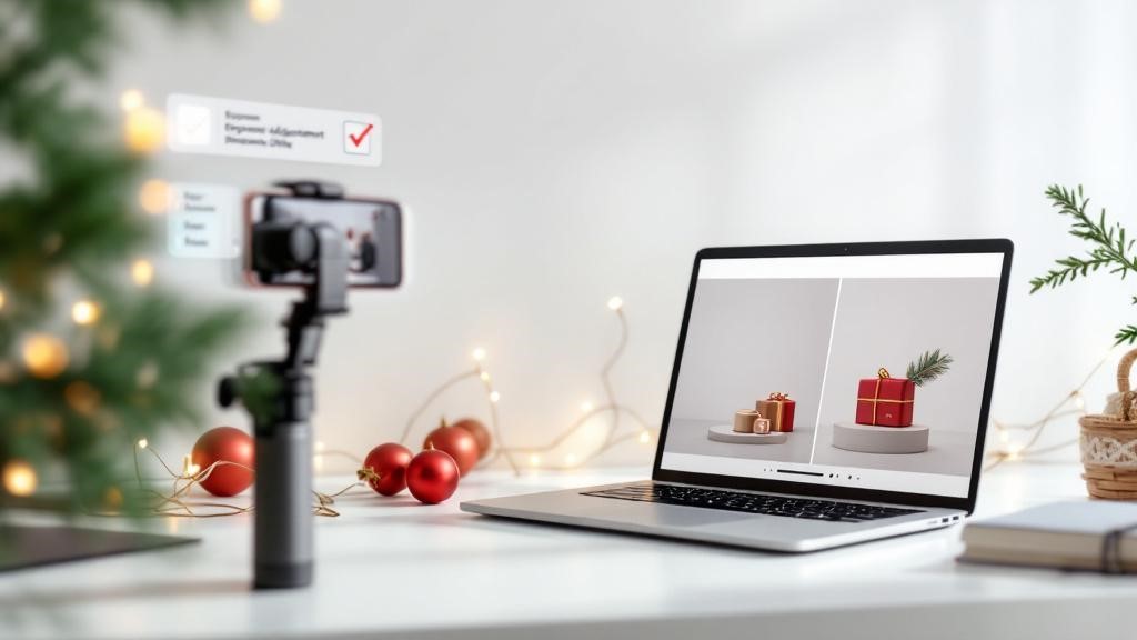 A ambientação sazonal contribui para o apelo emocional, especialmente para compras com foco em presente. Elementos natalinos funcionam melhor quando reforçam o contexto sem esconder o produto ou distorcer seu tamanho, cor ou funcionalidade.