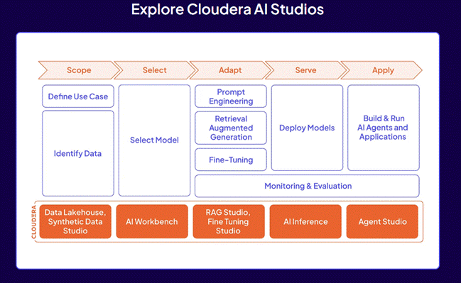 A plataforma está integrada ao portfólio Cloudera AI e funciona em conjunto com ferramentas como AI Workbench e AI Inference, fornecendo um ambiente completo para toda a jornada de IA empresarial, desde experimentação até implantação e monitoramento em escala.